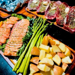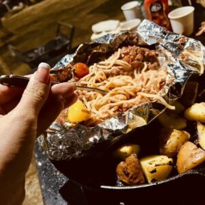 2. buổi tối đồ ăn nhiều đạm nên đem theo bia hay rượu vang nhẹ uống sẽ hợp hơn. Bữa ăn có măng tây, khoai tây… nhưng mình thấy rau vẫn ít nên đem theo salad hay rau củ ăn thêm với đồ nướng ( đồ ăn mình có để menu ở dưới hoặc xem trong hình )