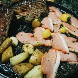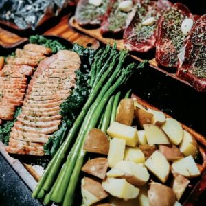+ set đồ ăn gồm : steak, lườn ngỗng, mì ý bò bằm, soup kem nấm, rau củ, nước uống, nước trái cây – mình ăn thấy lườn ngỗng khá okia